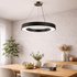 Es una lámpara de techo moderna con diseño geométrico en forma de hexágono. Está suspendida por cables desde una base circular y cuenta con iluminación LED integrada en sus superficies internas y externas. Su estilo minimalista y elegante la hace ideal para espacios contemporáneos.